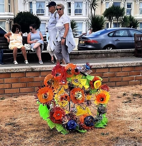 Adults from Camphill, near Buckfastleigh, have created a memorial wreath of recycled flowers, mounted on a bicycle wheel, after their original work, of a family wearing wetsuits, was left as a pile of dust.