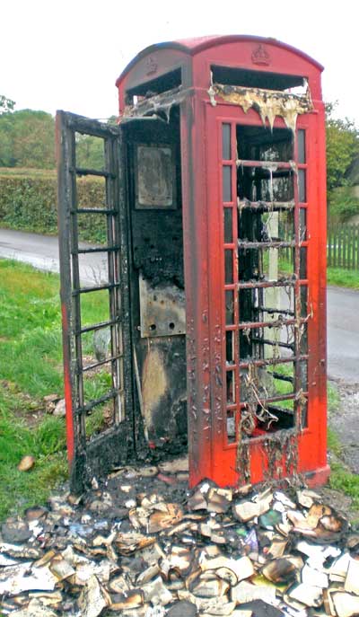 An arson attack saw the telephone box left a burnt-out shell and more than 100 books go up in flames.