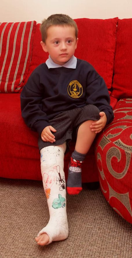 Four-year-old Lucien Woodhall-Cooper broke his leg in a freak accident at a soft play centre and is in a cast for six weeks.