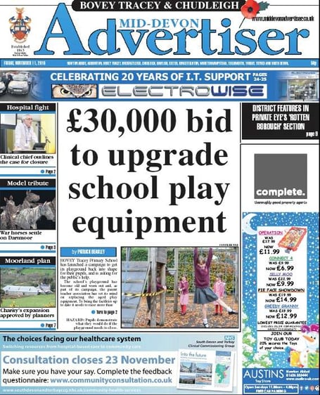 BOVEY Tracey Primary School has launched a campaign to get its playground back into shape for its pupils, and is asking for the public’s help; Clinical chief outlines the case for closure; War horses settle on Dartmoor; Charity’s expansion approved by planner; District features in Private Eye’s ’Rotten Borough’ section.