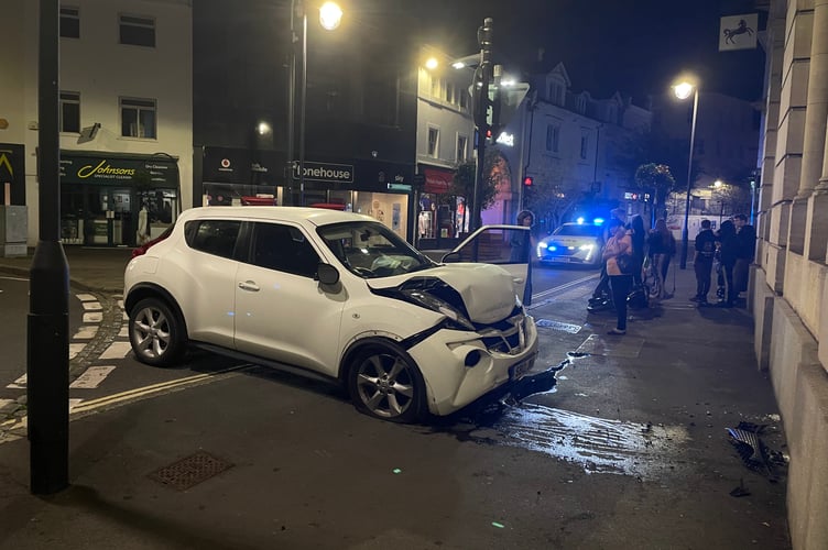 A CAR smashed into Lloyds Bank on Courtney Street in Newton Abbot last night at about 7.45pm. One onlooker, working late in an office next door, saw the incident.