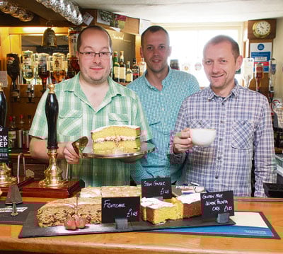 JAM FOR LAMB: Pictured with a Victoria sponge and a cup of tea are joint landlords of the Globe Inn Dan Simpson (left) and Lee Boxall, with barman Danny Andrews (centre). Picture Alan Craig.