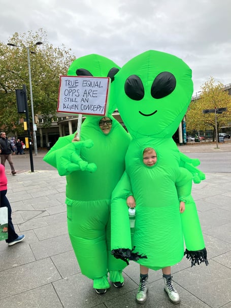 They dressed as green aliens, sending the message ‘true equal opportunities are still an alien concept’.