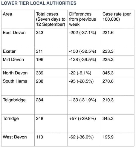 The only council area to report a rise in cases was Torridge, which recorded 248 new cases, 57 more than the previous week. The infection rate in the district is at 361, the highest in the county.