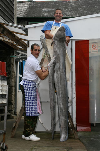THIS huge conger eel, which weighed more than 50 kilos before being gutted, is on display at Jacksons Fishmongers in Queen Street, Newton Abbot.It took three staff to lift the monster, whichis more than 10 feet from head to tail, on to the slab at the front of the shop, where it was on display yesterday (THURSDAY) and will remain today (FRIDAY) before being processed into fillet steaks.Amazingly the conger, which touches the scales at 46 kilos gutted – more than 100 lbs – was caught on rod and line from the Dartmouth angling boat Deborah Jane.But the boat fishes commercially and if it had been a record catch it would not have counted. According to the British Conger Club the world record rod caught conger is 133 lbs 4oz, landed by Vic Evans from a wreck off Berry Head, Brixham, in June 1995.Jacksons managing director Matt Endacott bought the conger for £50 at the 7am fish auction at Brixham Harbour on Wednesday.'I have been here for 17 years and I am the third generation of the family run business, and this is the biggest fish I have seen. About 12 years ago we had a monster conger which was 42 kilos gutted and that caused plenty of interest,' said Mr Endacott.