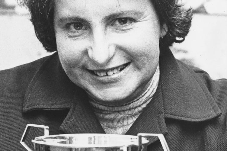 Rosemary Stapleton and the cup for winning Best Decorative Exhibit at the Chagford Show in the mid-1970s (MDA)