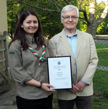 Carys Gwillam was unable to attend the recent Town Council meeting, so Cllr Tony Allen, who has co-ordinated the community awards scheme since their inception, paid a special visit to the town’s Scout hut to make the presentation.