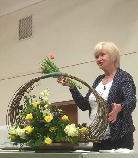 The sun was shinning through the large windows of the Courtenay Centre as Joan Trewin began her ‘Essence of Summer’ themed floral demonstration at May’s meeting of Newton Abbot Flower Club.
