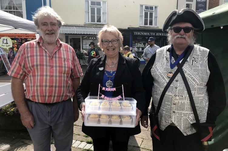 Teignmouth Mayor, Cllr Joan Atkins, and Town Cryer, Patrick Brophy, led the celebrations. Stallholder Lisa Sutcliffe of Pat-a-Cake made her famous birthday cupcakes for the occasion and Mayor Joan was very successful in passing these out to loyal customers.