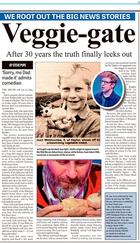 Comedian Josh, who hails from Haytor Vale, had been dining out on the the fact he’d picked up first prize for winning the Mini Beast Created from Fruit and Vegetables at the 1991 Ilsington Flower Show.
